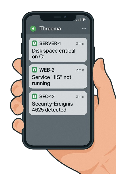 Schnelle Installation, umfassendes Monitoring (Ping, Disk, Services, Logs, Heartbeat) und automatisierte Alerts per Ticketsystem & Messenger.
